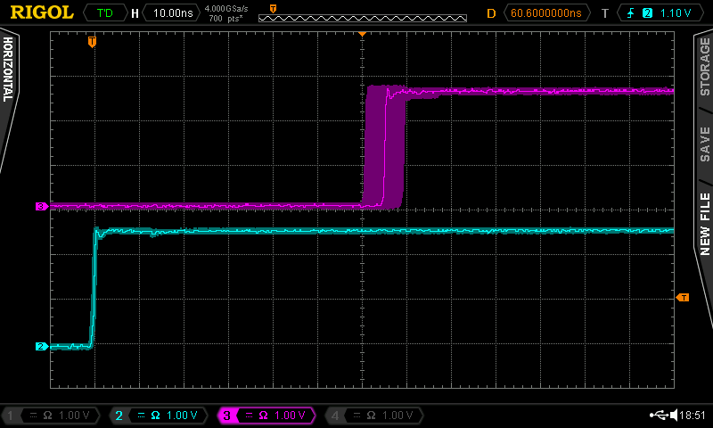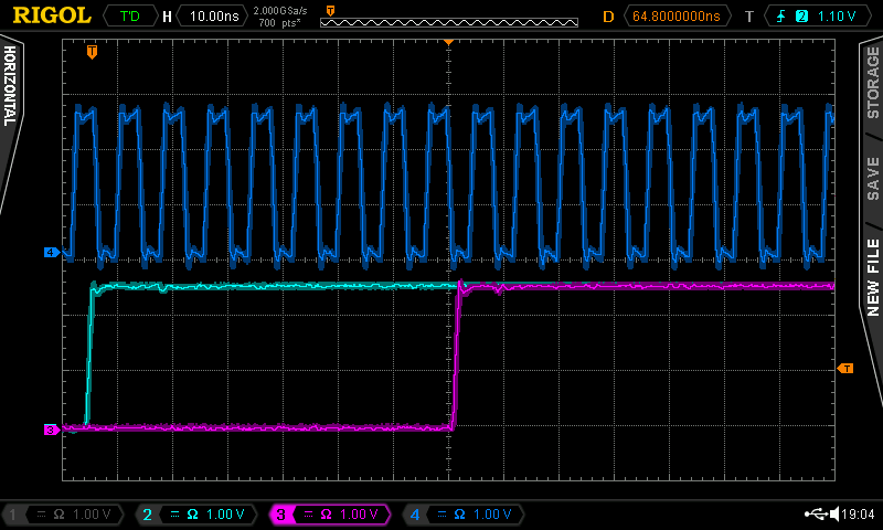 Clock signal (top), trigger signal (bottom left) at the critical position with dt=0 showing the discrete 8 ns output jitter (bottom right)