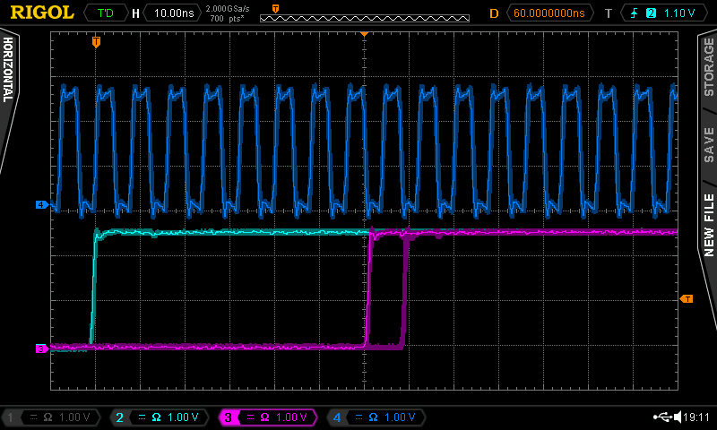 Pulse Streamer 8/2 clock (top, 125MHz), trigger signal (bottom left) and the data-out signal range (bottom center)