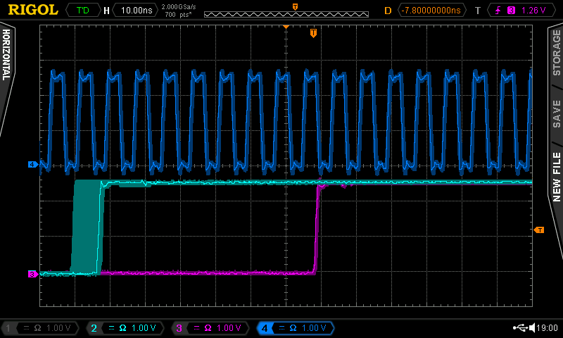 Clock signal (top), trigger signal (bottom left) at the critical position with dt=0 showing the discrete 8 ns output jitter (bottom right)